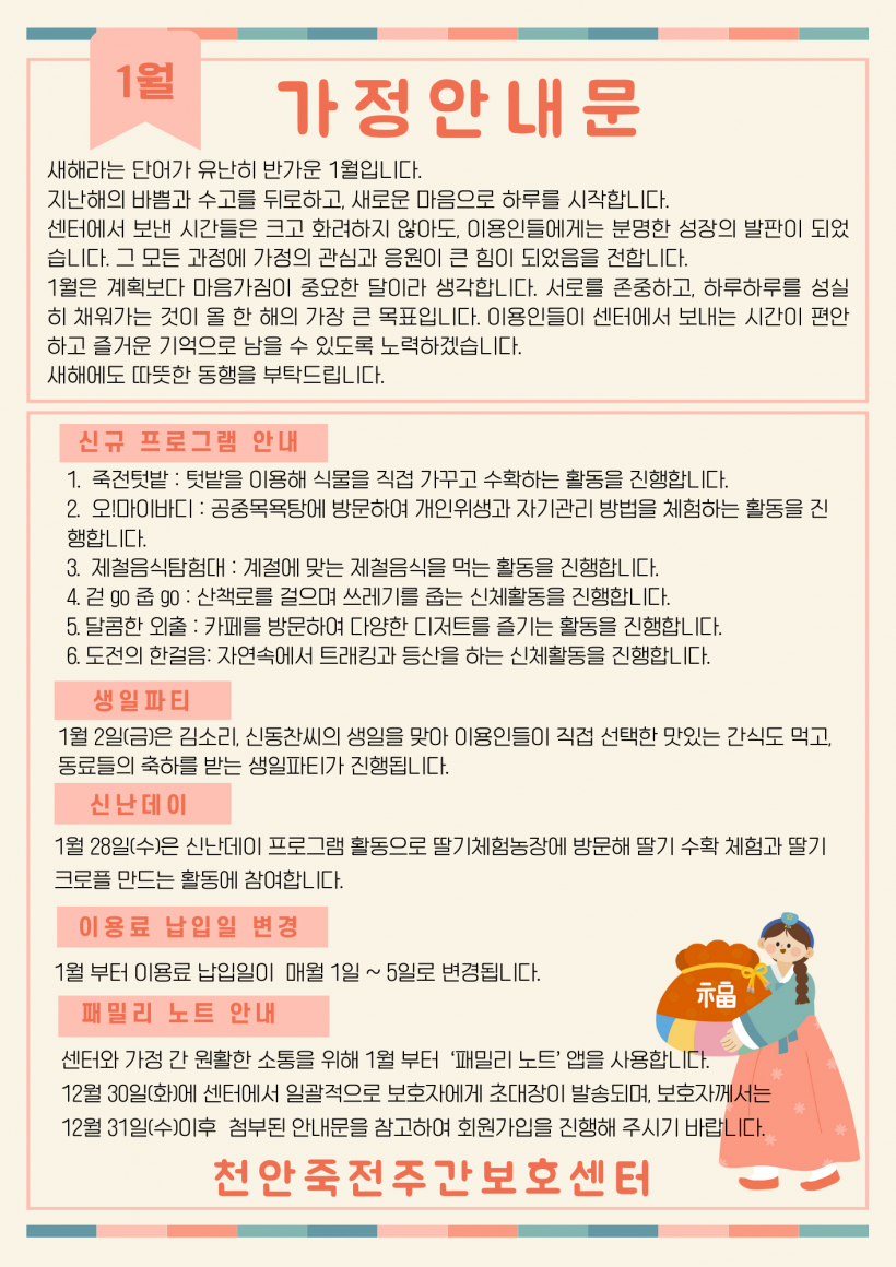 2026년 1월 가정안내문 페이지 정보 작성자 김미리 작성일26-01-05 14:44 조회53회 댓글0건 이전글 다음글 목록 본문 2026년 1월 가정안내문 입니다. 댓글목록 등록된 댓글이 없습니다. 이전글 다음글 목록