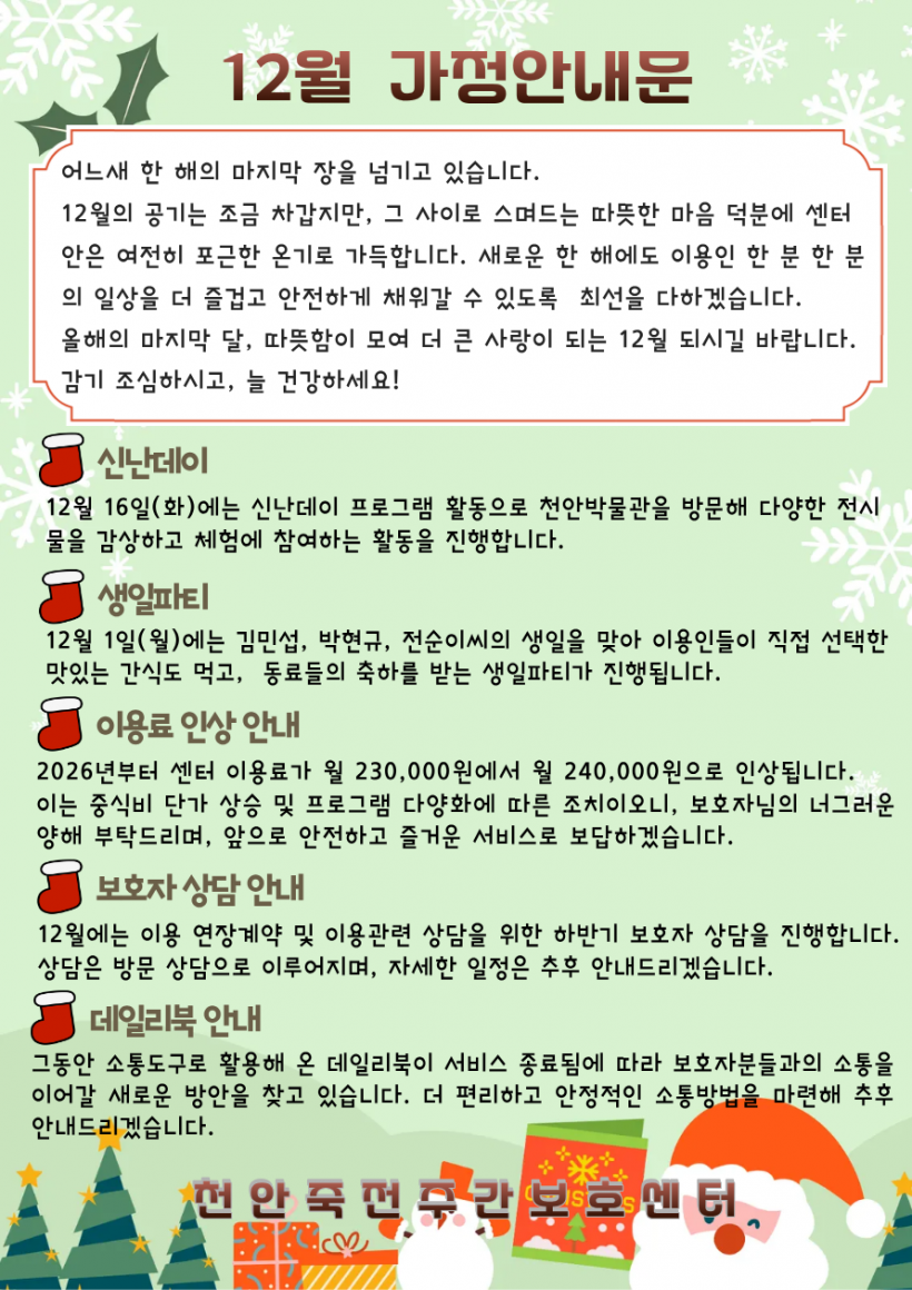 2025년 12월 가정안내문 페이지 정보 작성자 김미리 작성일25-11-28 15:20 조회262회 댓글0건 이전글 다음글 목록 본문 12월 가정안내문 입니다. 댓글목록 등록된 댓글이 없습니다. 이전글 다음글 목록