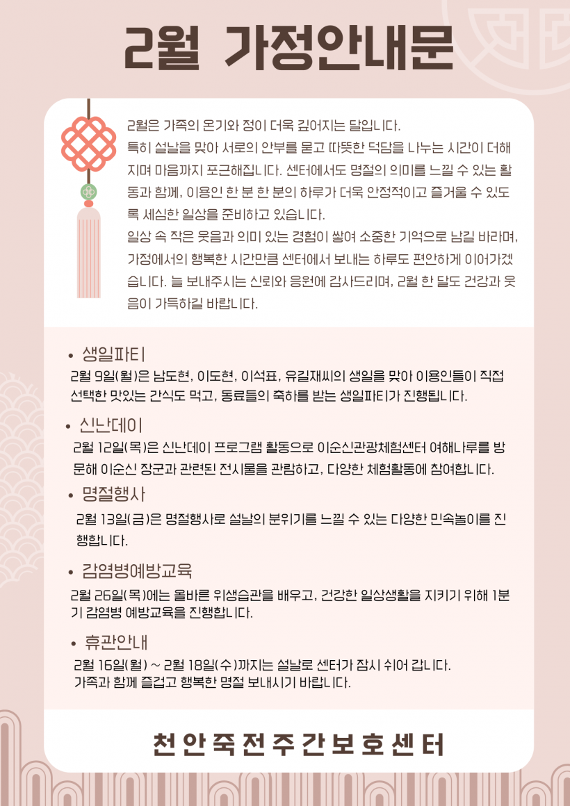 2026년 2월 가정안내문 페이지 정보 작성자 김미리 작성일26-01-29 16:17 조회305회 댓글0건 이전글 다음글 목록 본문 2월 가정안내문입니다. 댓글목록 등록된 댓글이 없습니다. 이전글 다음글 목록