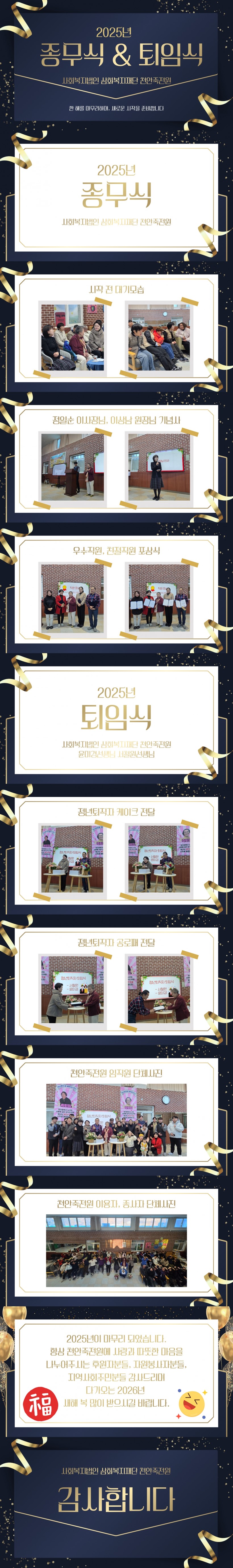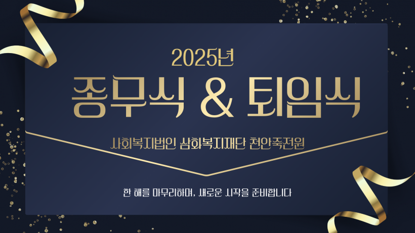2025년 사회복지법인 삼화복지재단 천안죽전원 종무식 & 퇴임식 페이지 정보 작성자 운영자 작성일25-12-31 13:33 조회442회 댓글0건 관련링크 목록 본문 2025년 사회복지법인 삼화복지재단 천안죽전원 종무식 & 퇴임식을 진행하였습니다.항상 천안죽전원 가족분들의 얼굴에 웃음꽃이 활짝 피실 수 있는 죽전원이 되겠습니다!다가오는 2026년 새해 복 많이 받으세요!감사합니다. 댓글목록 등록된 댓글이 없습니다. 목록