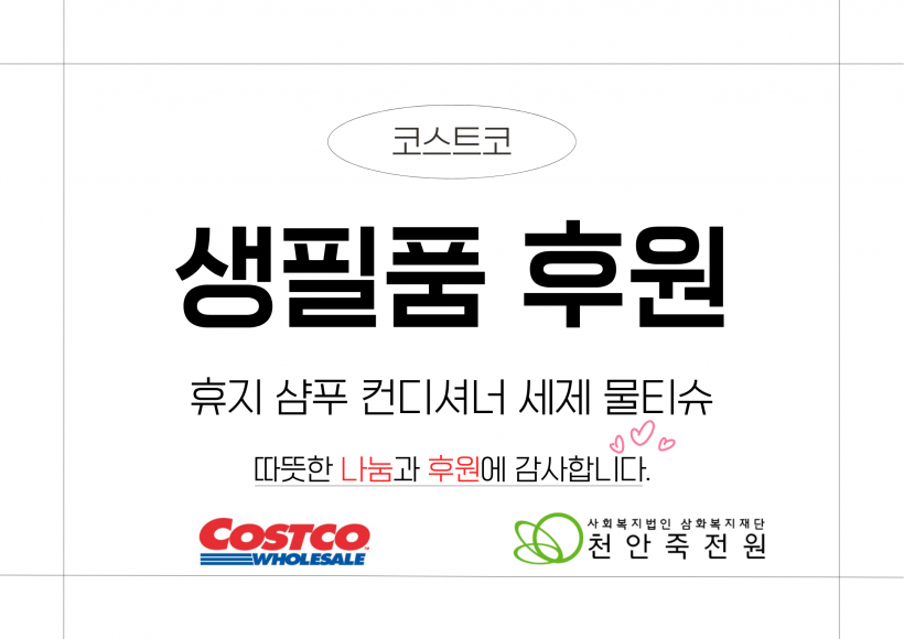 코스트코 생필품 후원 페이지 정보 작성자 운영자 작성일26-02-05 14:15 조회229회 댓글0건 관련링크 목록 본문 26.02.04.(수)코스트코 천안지점에서 휴지, 샴푸, 컨디셔너, 세제, 물티슈를 후원해주셨습니다.천안죽전원 가족분들이 일상생활에서 잘 사용하실 수 있도록 지원하겠습니다.천안죽전원에게 사랑과 나눔을 해주신 코스트코에게 다시한번 감사의 말씀을 드립니다.감사합니다. 댓글목록 등록된 댓글이 없습니다. 목록