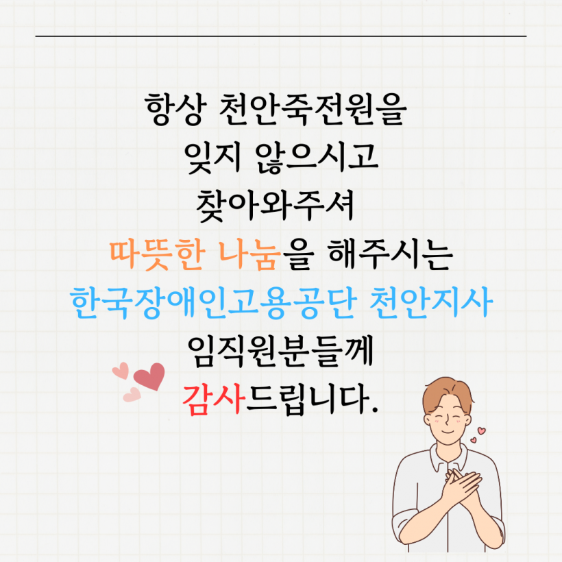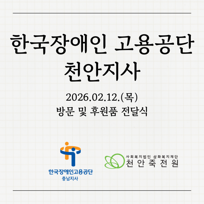 한국장애인고용공단 천안지사 방문 페이지 정보 작성자 운영자 작성일26-02-23 16:00 조회90회 댓글0건 관련링크 목록 본문 26.02.12.(목)한국장애인고용공단 천안지사에서 임직원분들이 방문해주셨습니다.항상 따뜻한 관심과 소중한 나눔을 해주시는 한국장애인고용공단 천안지사 임직원 분들께 감사드립니다. 댓글목록 등록된 댓글이 없습니다. 목록