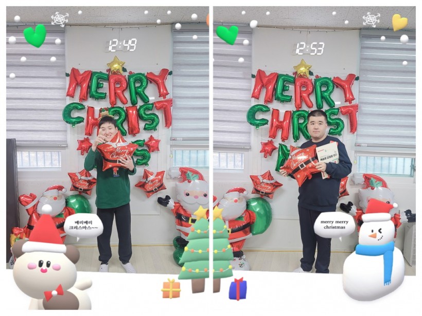 반짝이는 장식으로 꾸며진 크리스마스 포토존에서 사진을 찍으며 웃음 가득한 순간을 먼저 담아보았는데요.