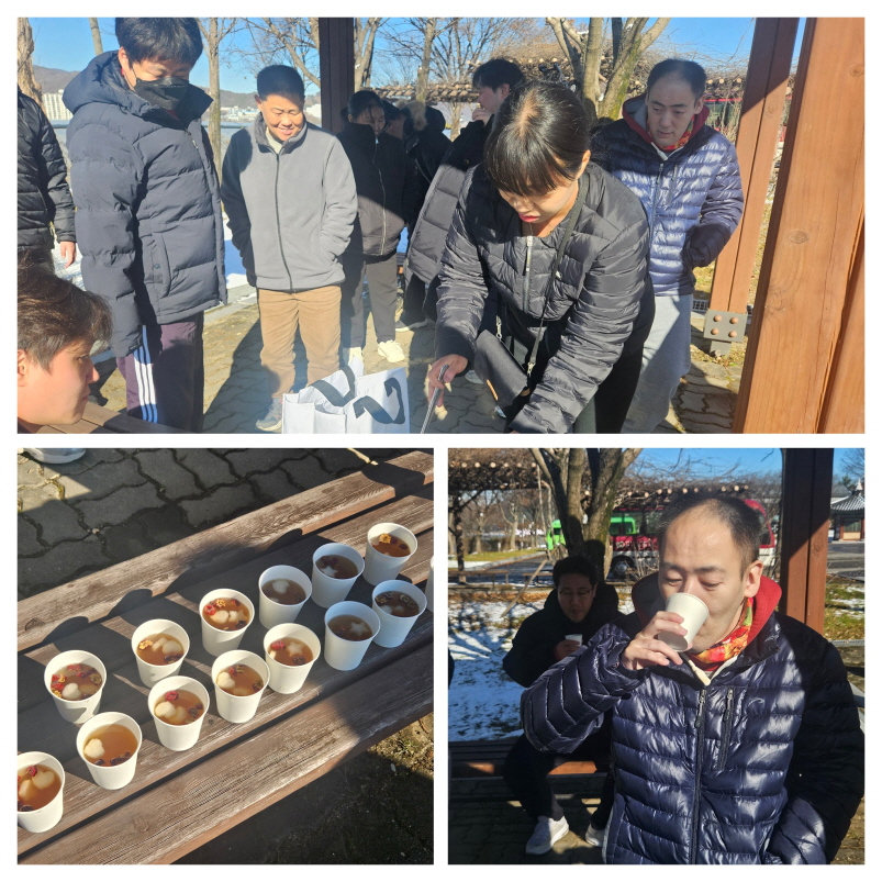 이번 드라이브의 목적지는 유관순 열사 기념관이었습니다. 차분한 분위기 속에서 잠시 발걸음을 멈추고 주변을 둘러보며, 겨울의 공기와 고요함을 천천히 즐겼습니다. 버스에서 내려 살짝 차가워진 몸을 녹여준 것은 바로 센터에서 정성껏 준비한 배생강차였습니다. 배, 생강, 계피, 대추를 넣어 끓인 따뜻한 차 한 잔은 손과 마음까지 포근하게 만들어 주었습니다.